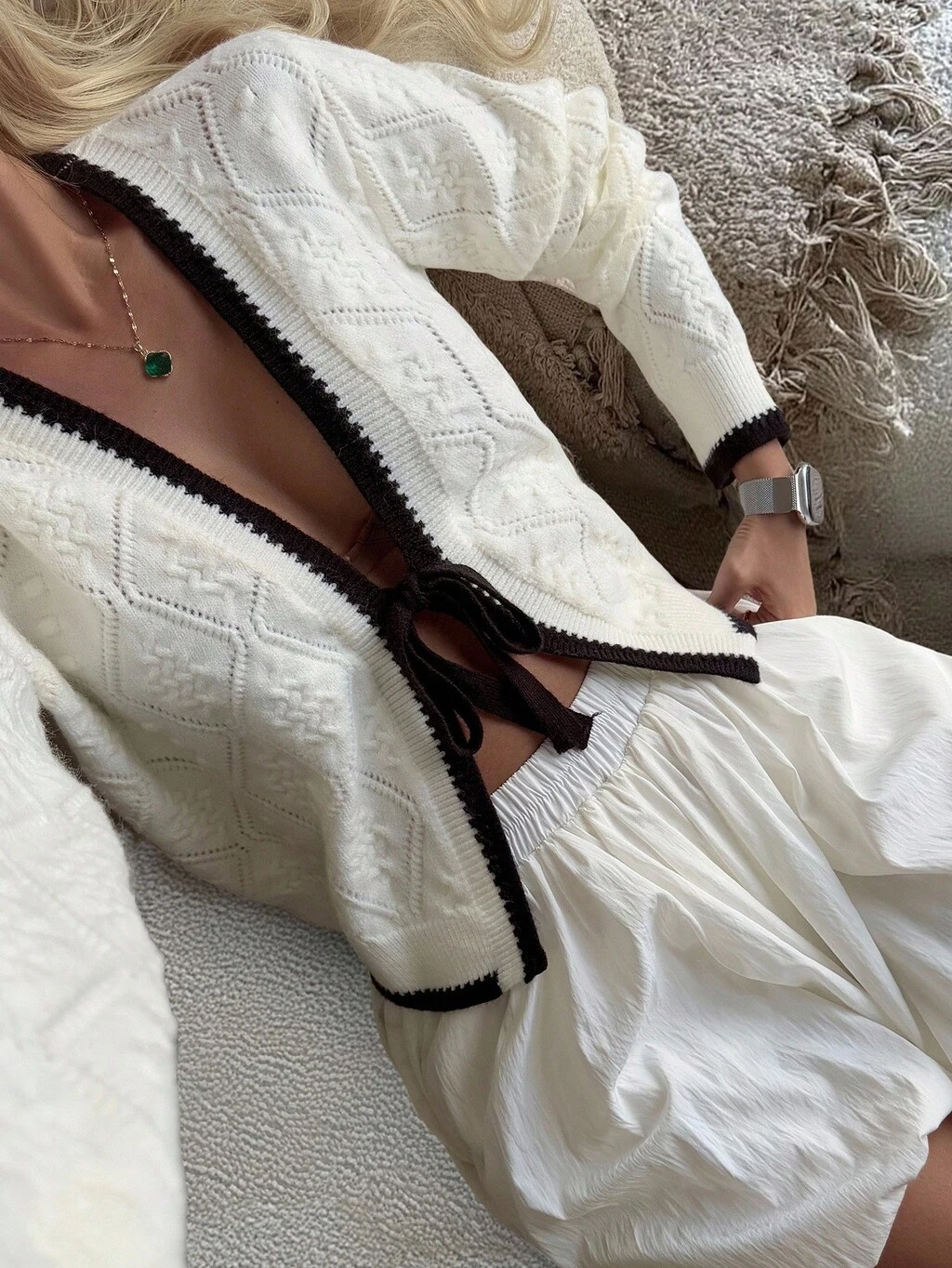 Elegancki kardigan damski z kontrastowym dekoltem w serek i kokardą, jesień/zima, jesienne ubrania damskie