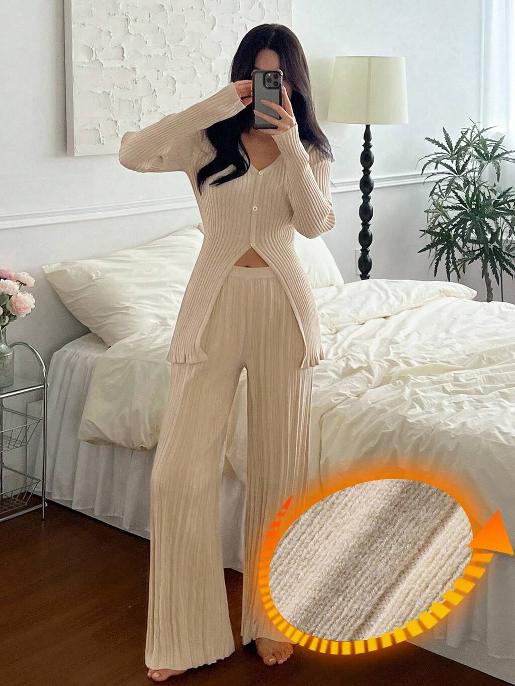Damski dzianinowy luźny top z dekoltem w serek i rozkloszowanymi spodniami, swobodny zestaw domowy, zimowy