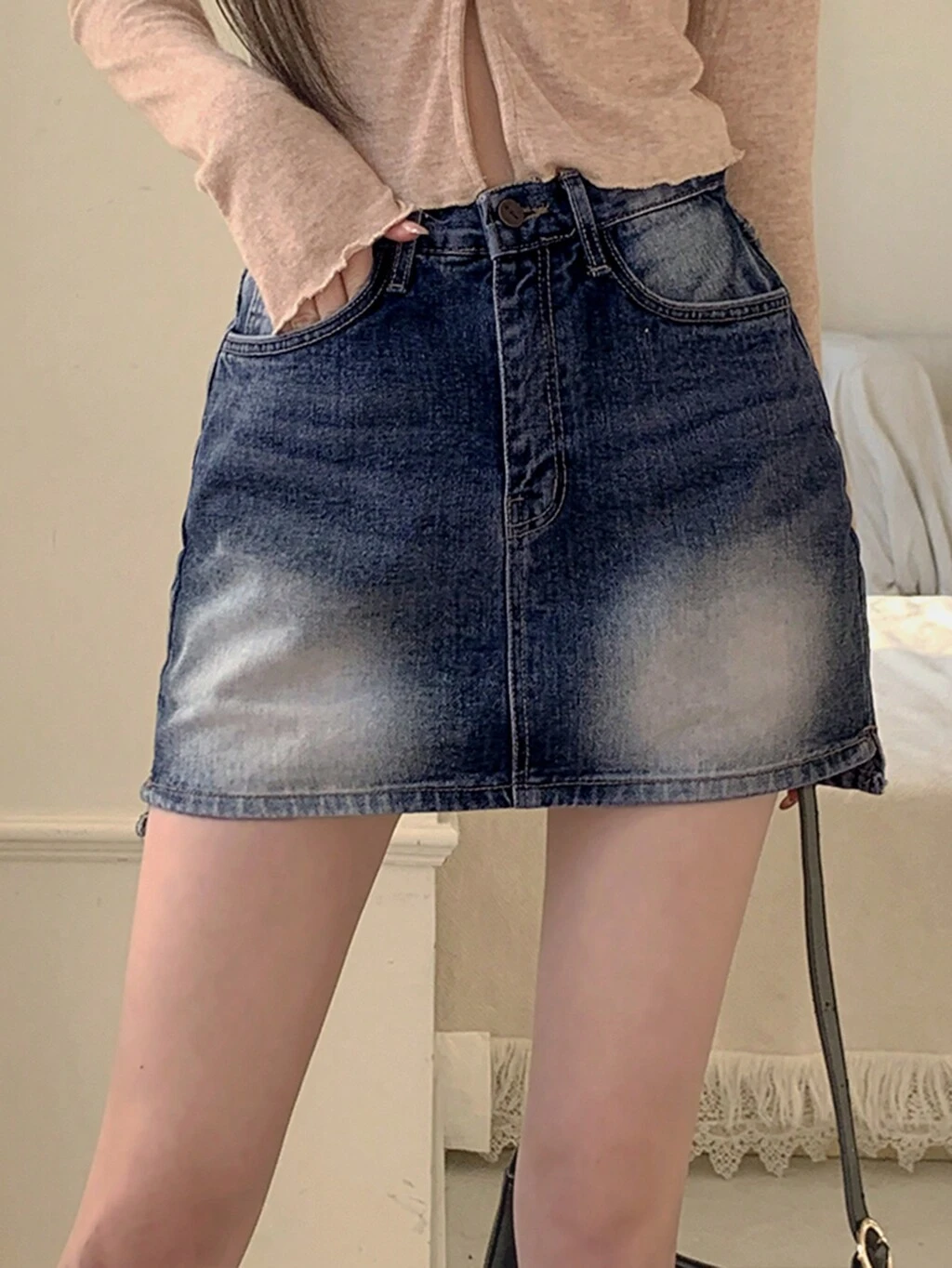 Spódnica jeansowa damska w stylu retro z asymetrycznym wykończeniem i wyblakłym wykończeniem