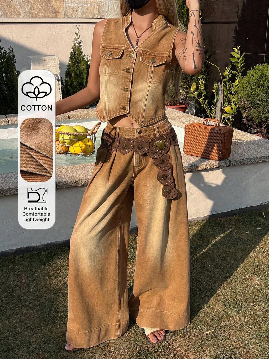 Damski, swobodny, sprany, dżinsowy garnitur z kamizelką i szerokimi nogawkami, dwuczęściowy, wiosna/lato, sukienka na wesele dla gości