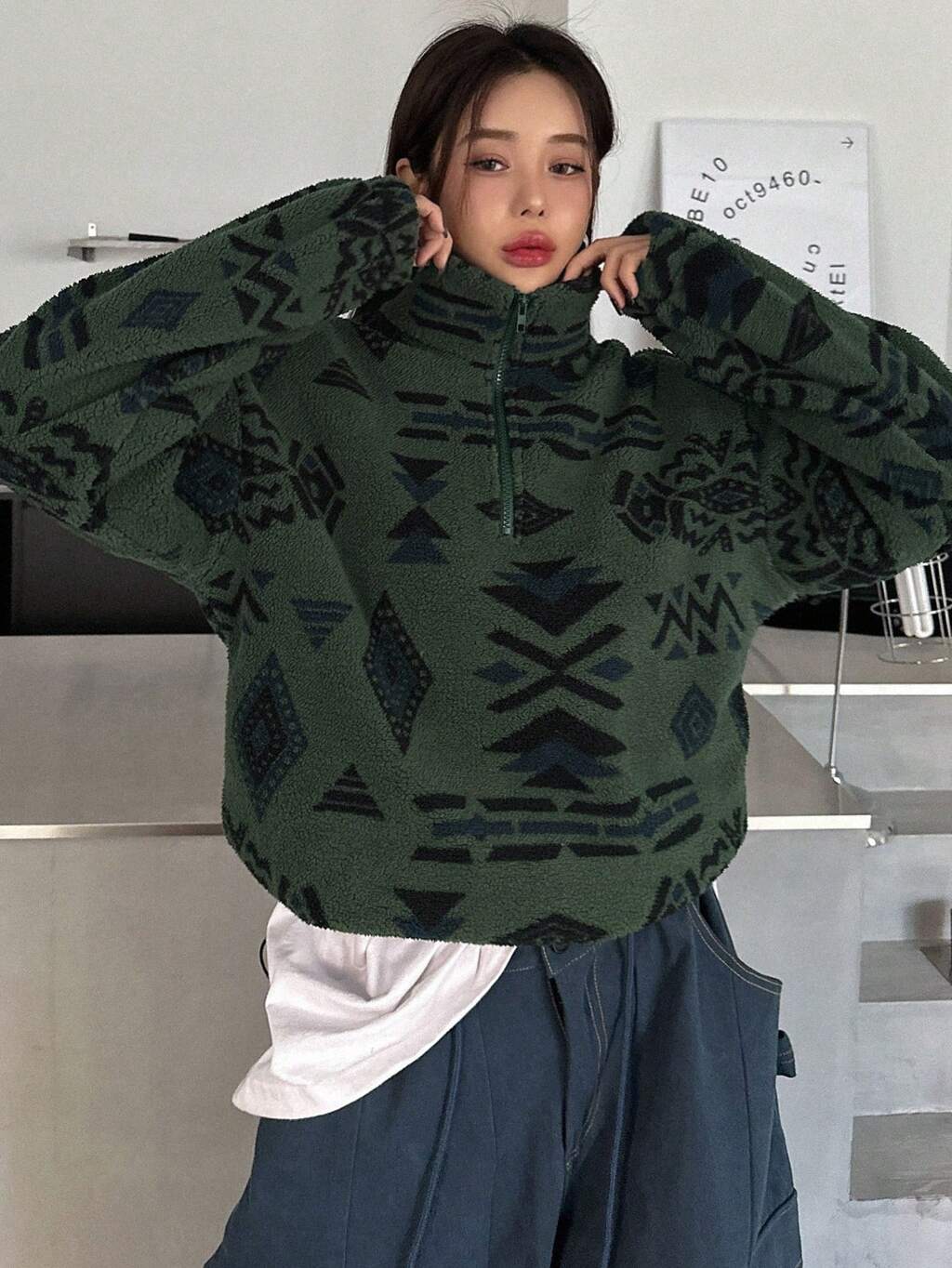 Bluza damska z geometrycznym nadrukiem, zapinana na zamek, bluzki z długim rękawem, jesienna odzież damska, podszewka termiczna