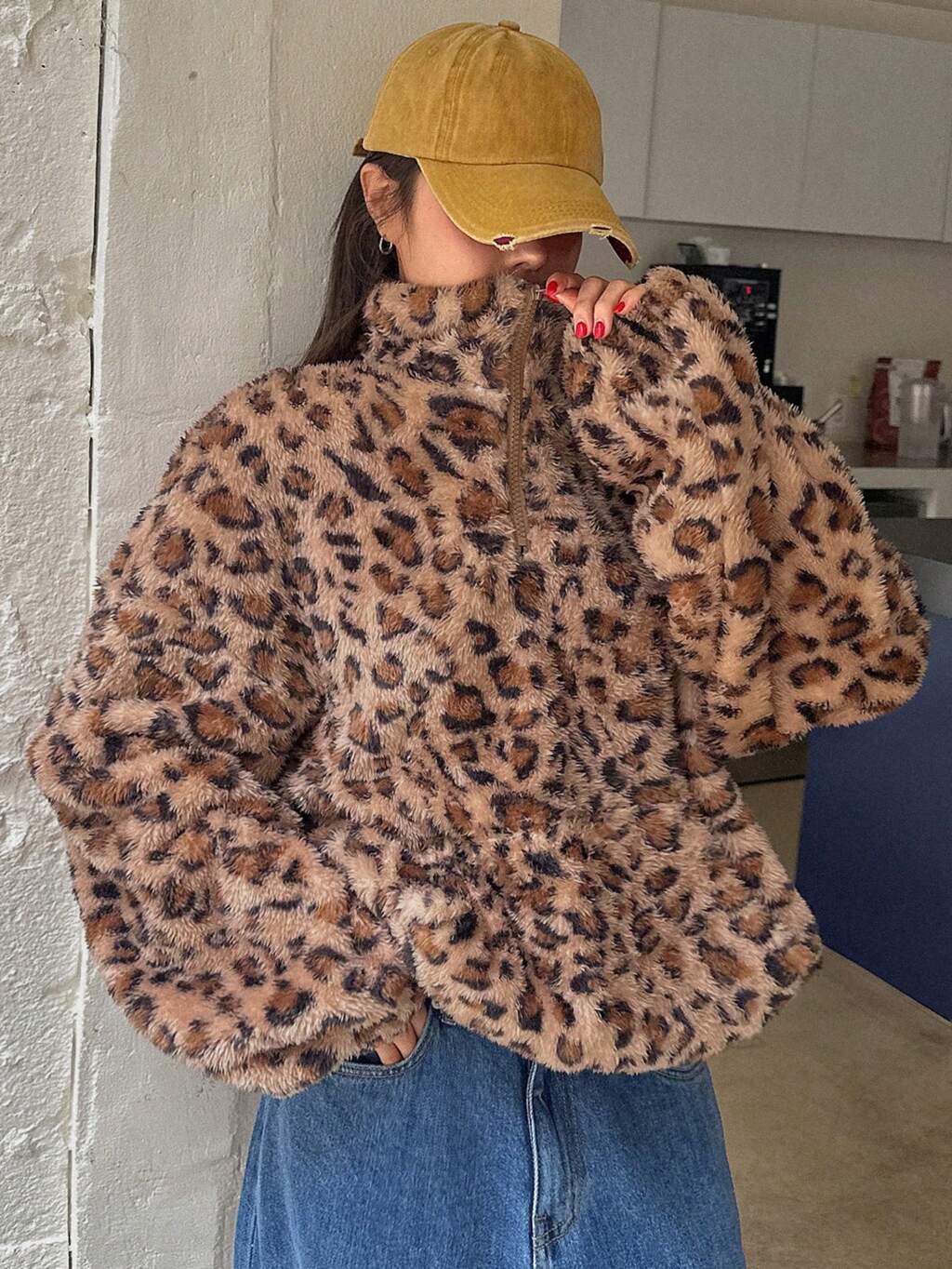 Damska bluza z kapturem i nadrukiem w panterkę, luźna, swobodna bluza w stylu ulicznym, zapinana na zamek