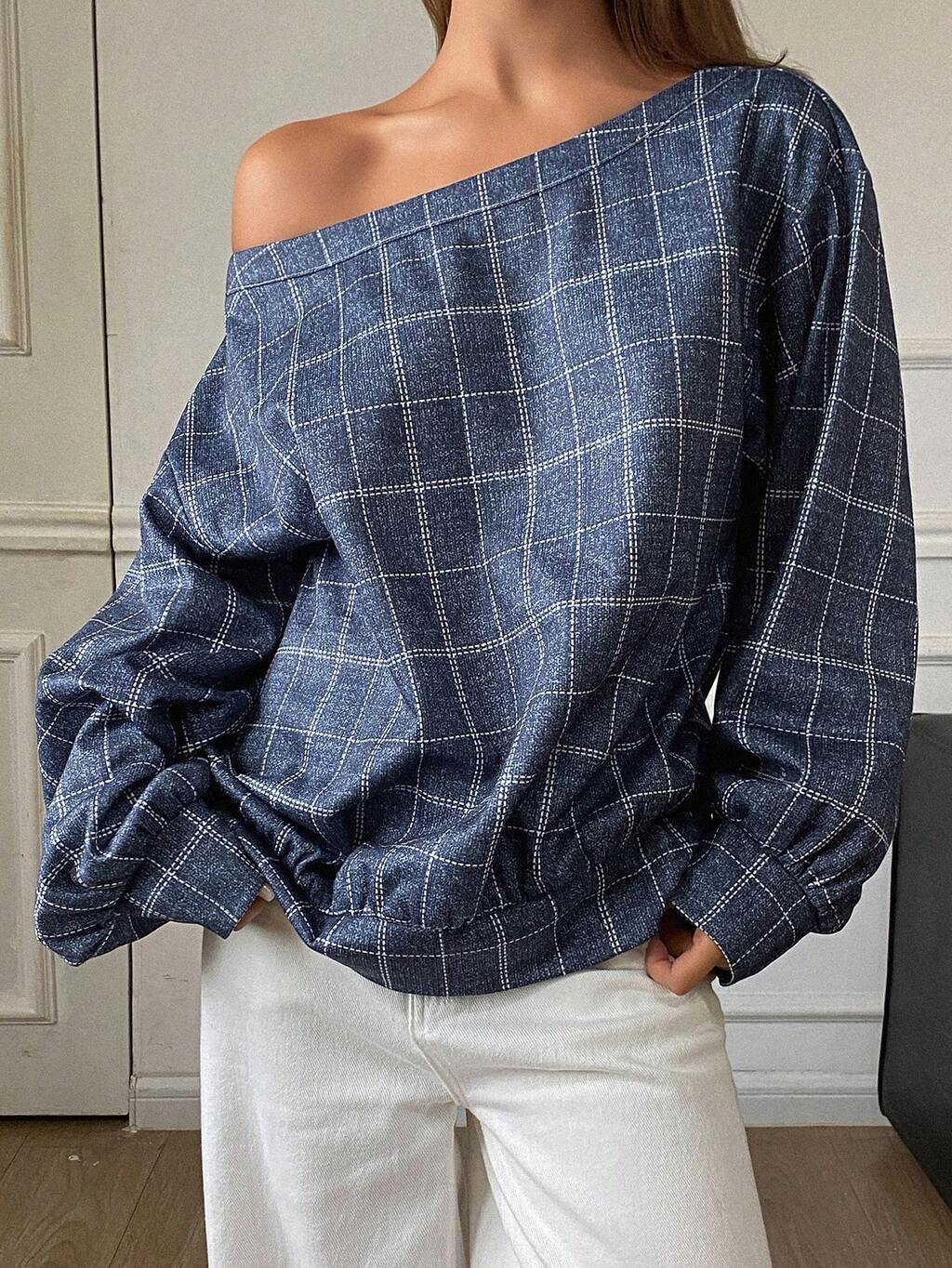 Damska bluza w kratę, casualowa, z okrągłym dekoltem, jesienna