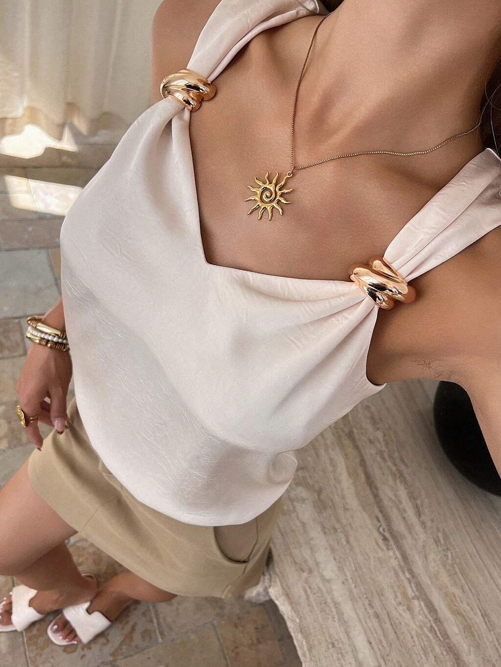Damski, jednolity kolor, dekolt w serek, metalowy guzik, elegancki, wakacyjny, letni top bez rękawów, rejs dla kobiet