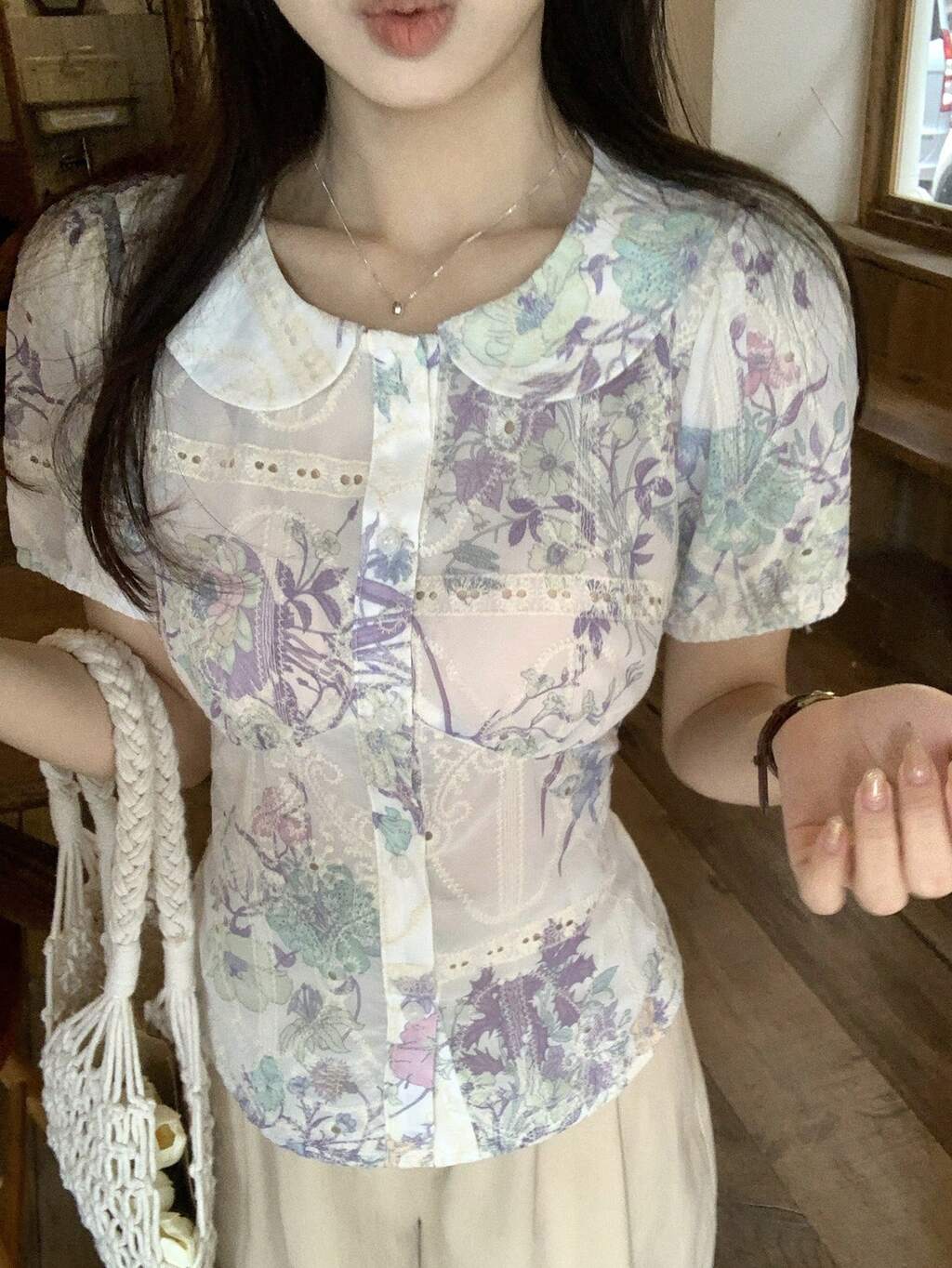 Wiosenno-letnia biała bluzka w drobne kwiatki na co dzień dla kobiet