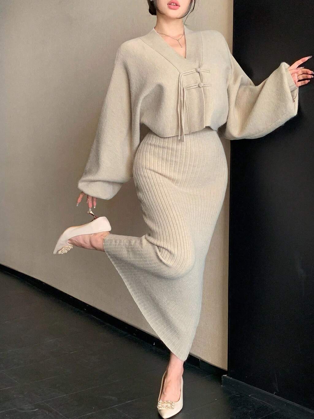 Dwuczęściowy, elegancki komplet damski, sweter z rękawami typu nietoperz i guzikami, z dzianiny, w jednolitym kolorze, na jesień