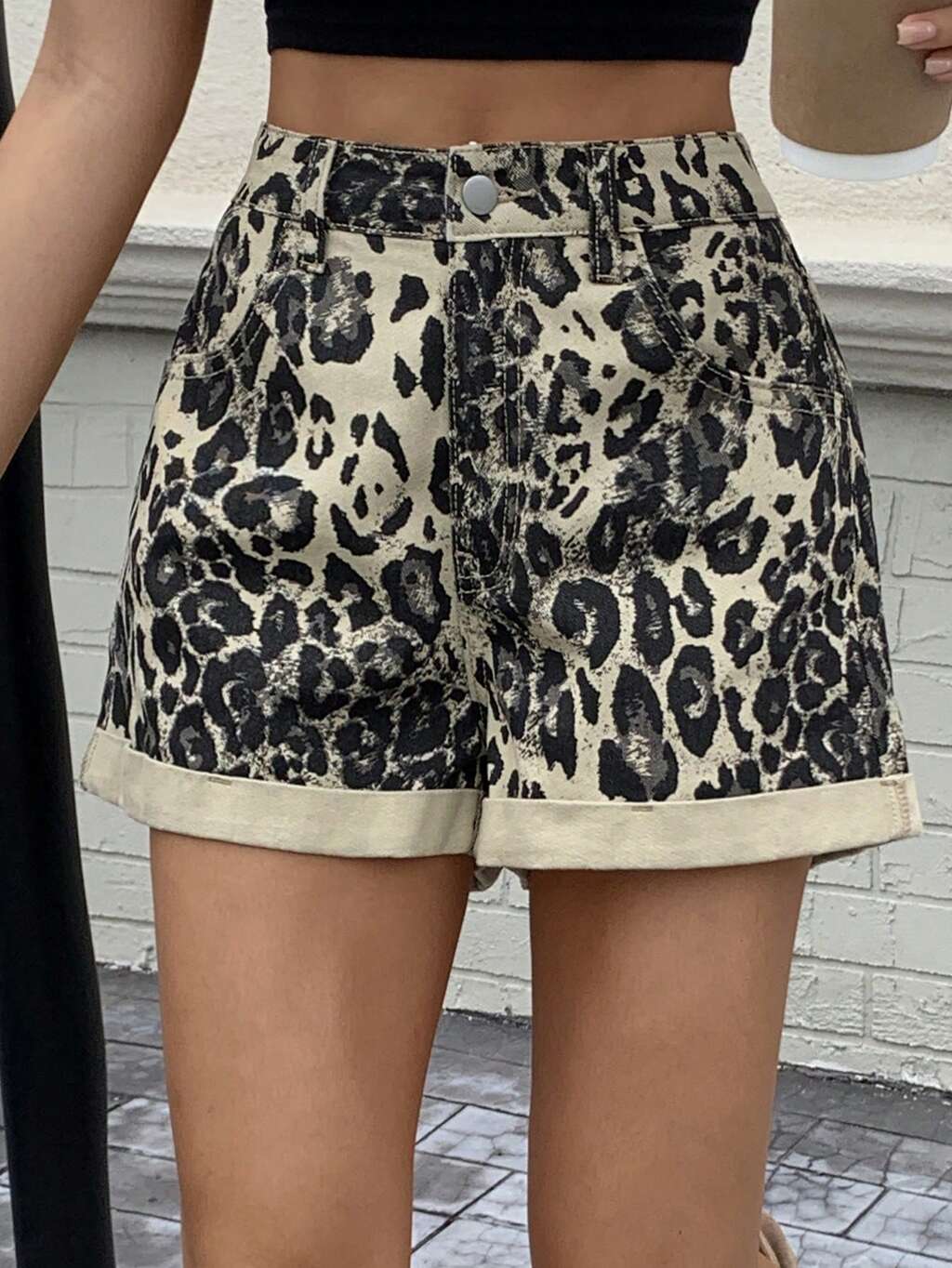 Damskie szorty jeansowe z nadrukiem w panterkę i mankietami, styl uliczny