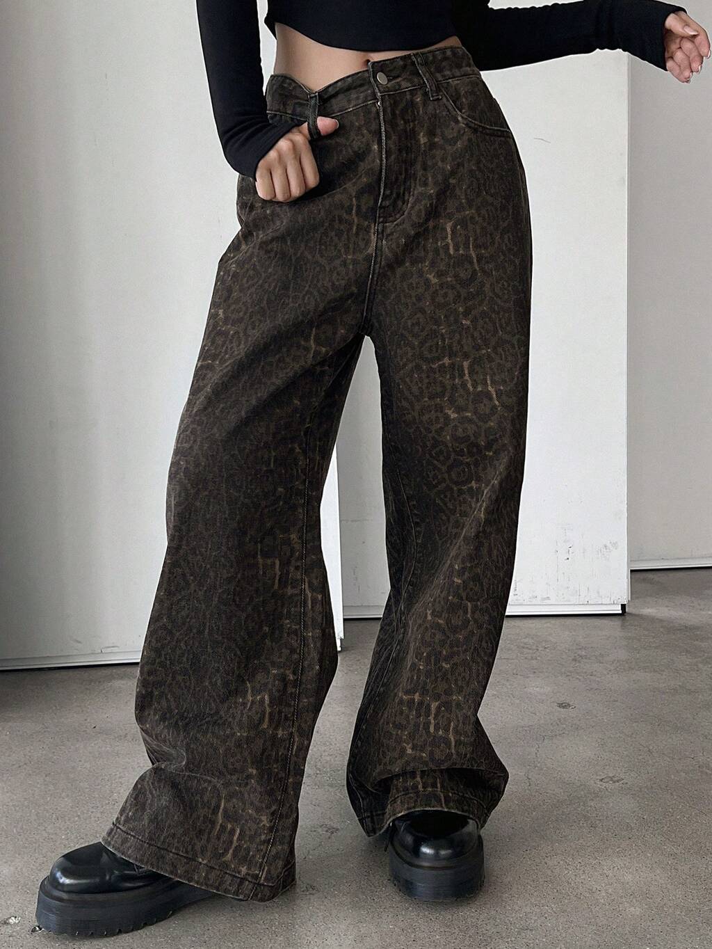 Spodnie damskie typu cargo z nadrukiem w panterkę, dżinsy z dużymi kieszeniami
