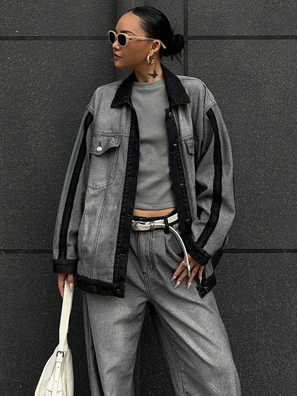 Damska kurtka dżinsowa z kontrastowym kołnierzykiem i prostymi nogawkami, swobodny garnitur dżinsowy