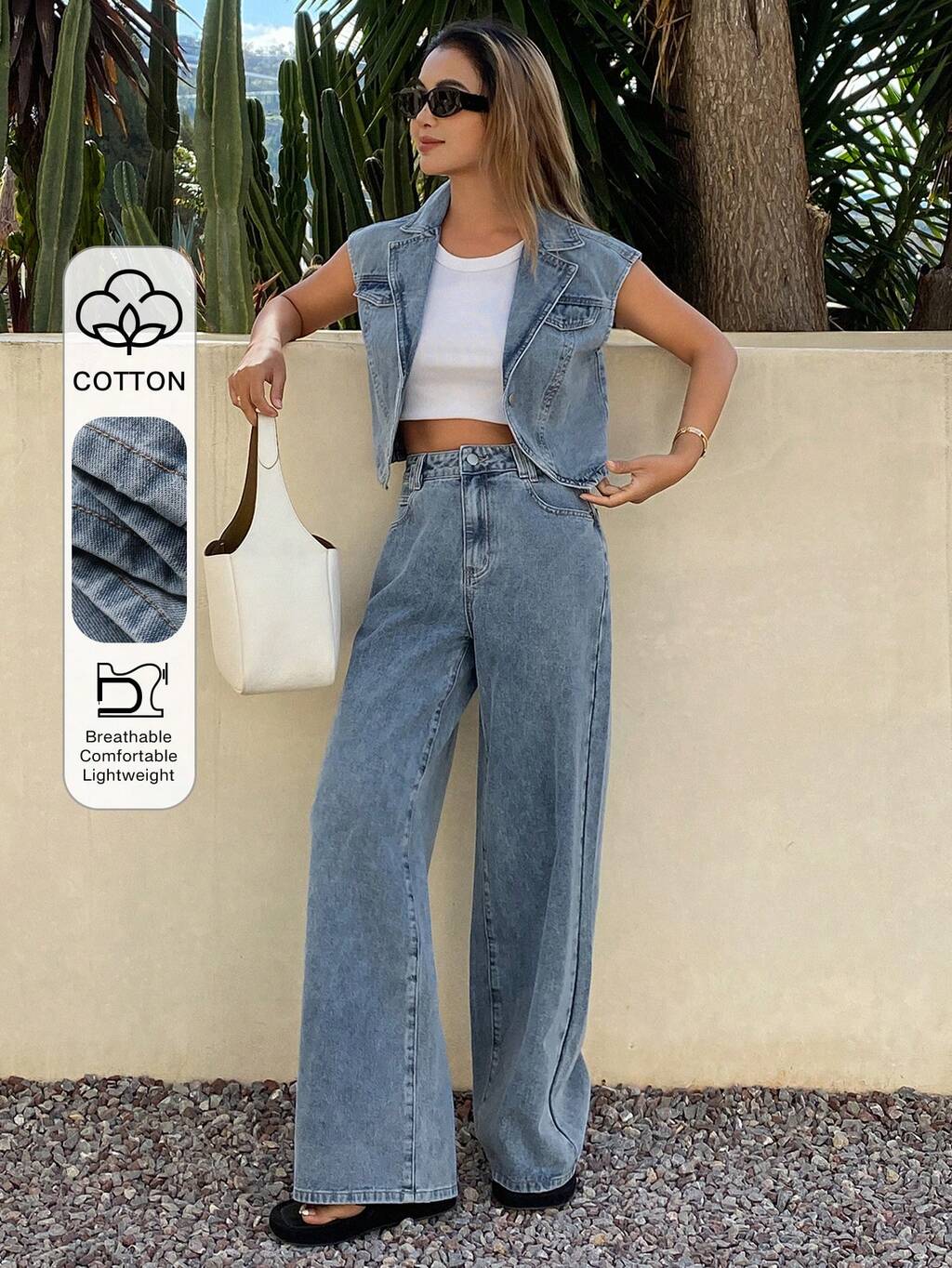 Stylowy komplet damski: kamizelka z dekoltem w serek, dżinsowa marynarka, spodnie z szerokimi nogawkami, letni