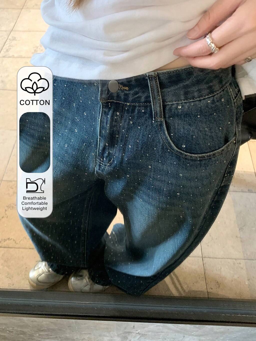 Damskie jeansy z kieszeniami, guzikami i zdobieniem ze strasu, uniwersalne, codzienne, szerokie nogawki