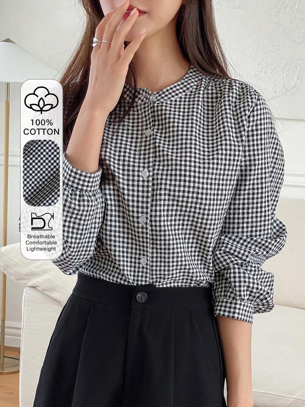 Koszula z nadrukiem w kratkę gingham zapinana z przodu na guziki, bluzki z długim rękawem