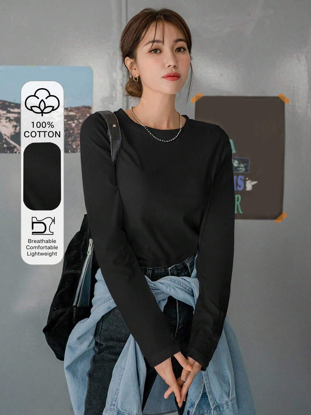 Damska koszulka z okrągłym dekoltem, jednolitym kolorem, dopasowana, swobodna, z długim rękawem