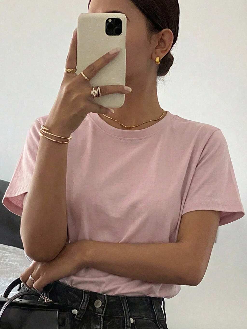 Damska koszulka z krótkim rękawem, okrągłym dekoltem i jednolitym kolorem, uniwersalna, na co dzień