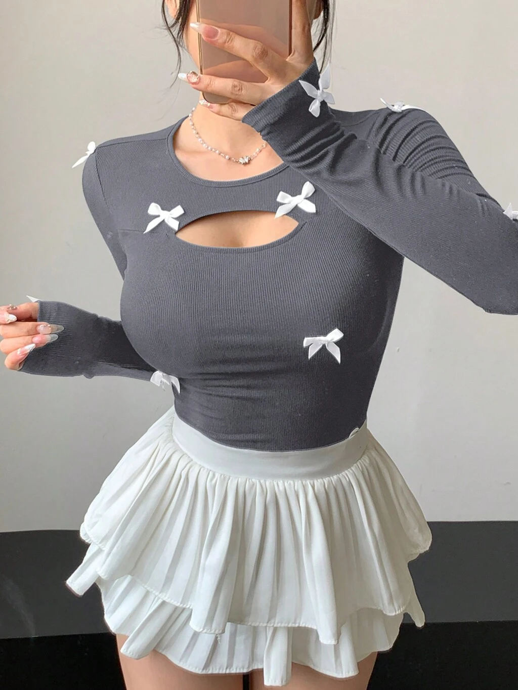 Nowość Jesienna kokardka dekoracyjna Slim Fit T-shirt dla kobiet z długim rękawem