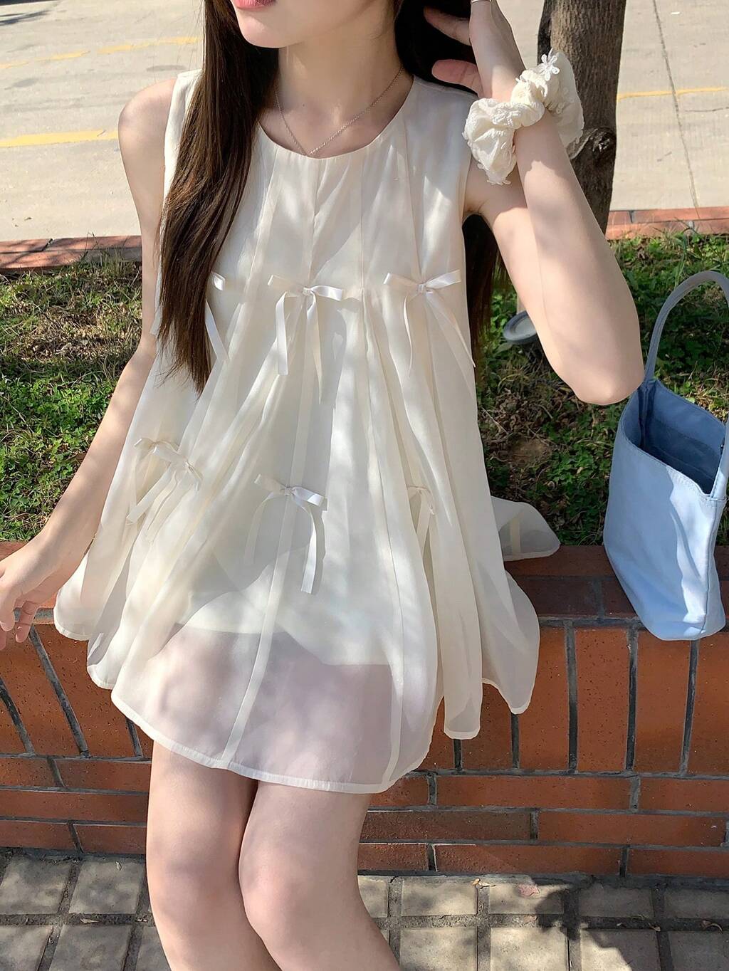Damski słodki motylkowy organza patchworkowy top bez rękawów, uroczy i młodzieżowy, letni top typu babydoll bez rękawów