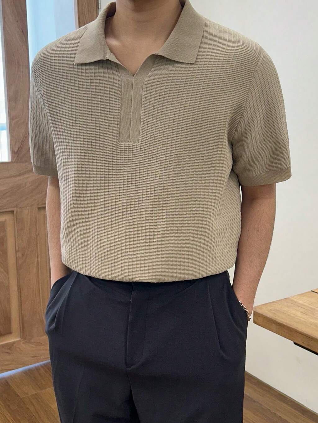 Top Polo de Malha de Manga Curta Gola Polo Cor de Damasco para Homens, Verão