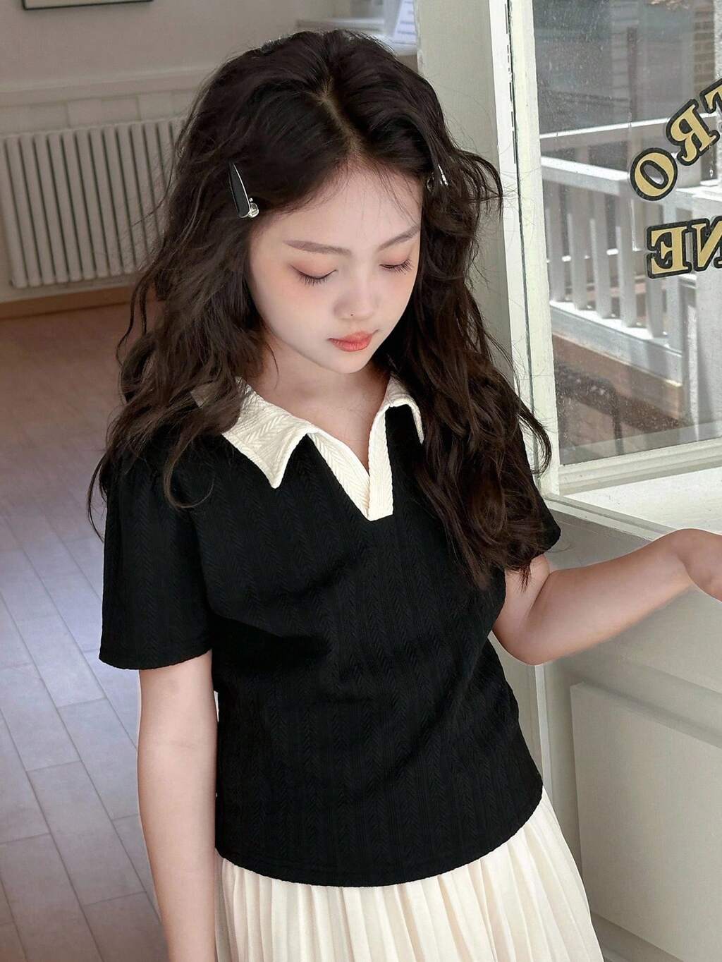 Camiseta Casual Versátil com Gola Colorblock e Manga Curta para Meninas Pré-Adolescentes, Verão, Volta às Aulas