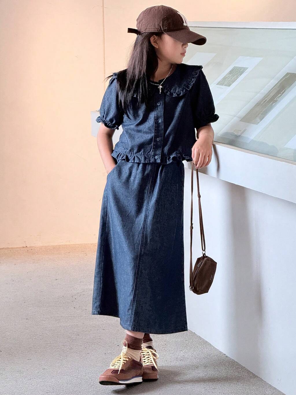 Conjunto Denim com Gola Babada para Meninas Pré-Adolescentes, Roupas de Verão e Volta às Aulas