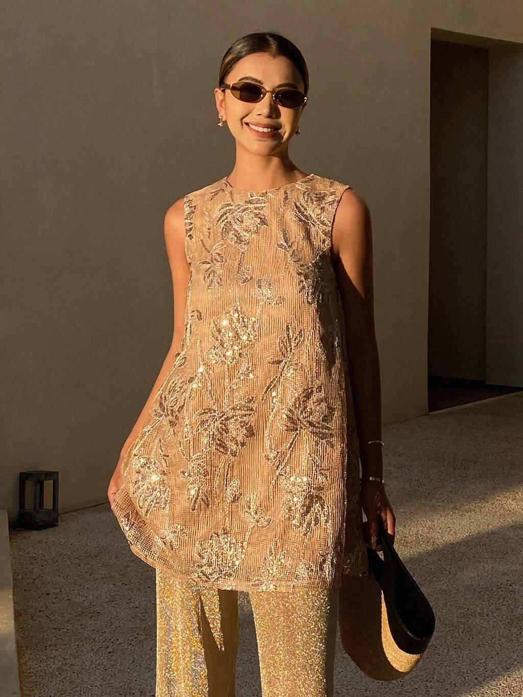 Top Elegante Feminina com Decoração de Lantejoulas e Recorte, Vestido de Convidada de Casamento Feminino para Verão