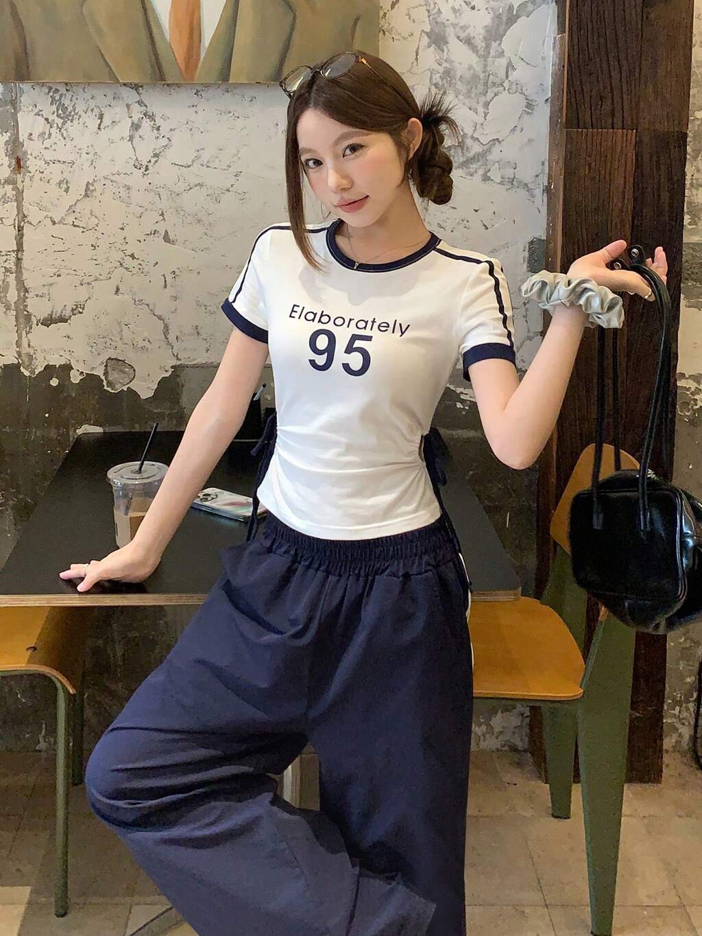 Camiseta de Manga Curta Casual Versátil para Uso Diário no Verão, com Decote Redondo, Estampa de Letras e Números, Design Plissado Torcido
