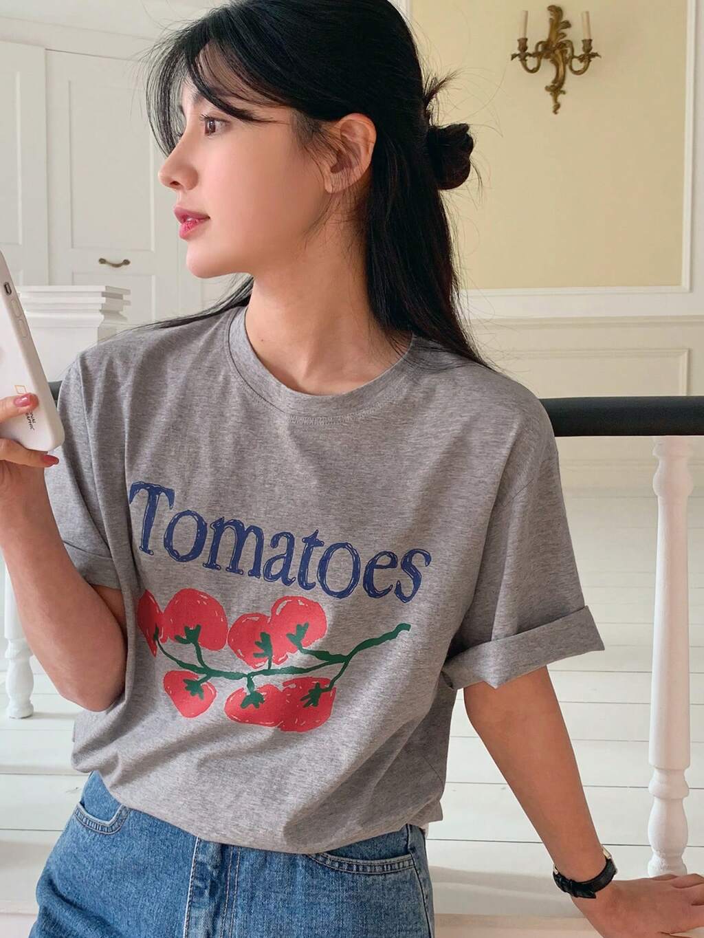 Camiseta Casual Feminina de Verão com Gola Redonda, Solta, Estampada
