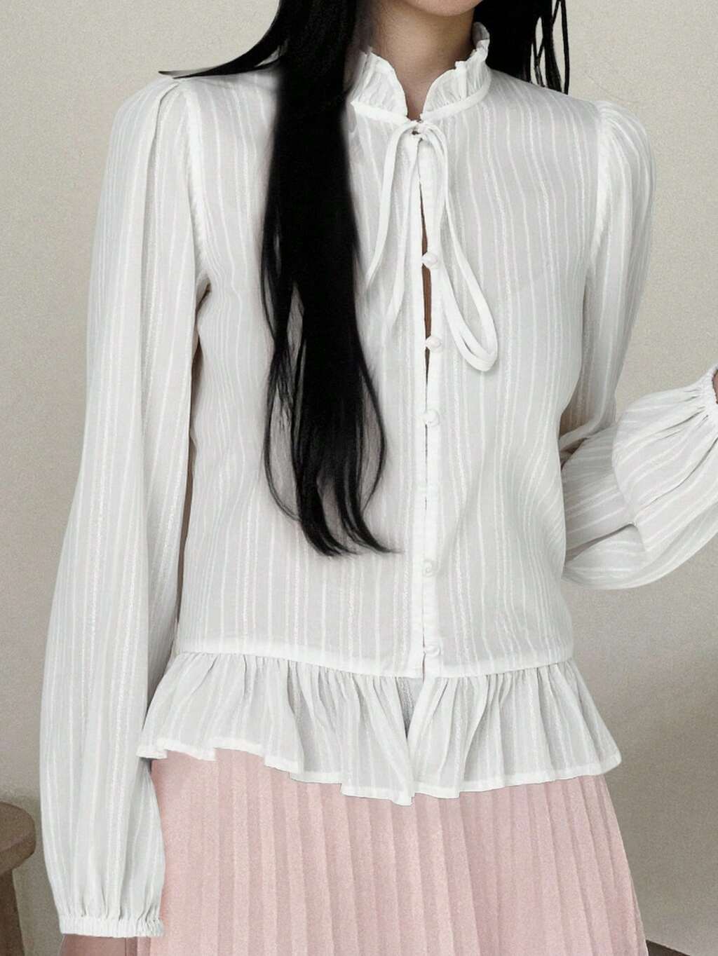 Camisa de Manga Longa com Babado e Amarração na Frente, Camisa de Cor Sólida de Abotoamento Único