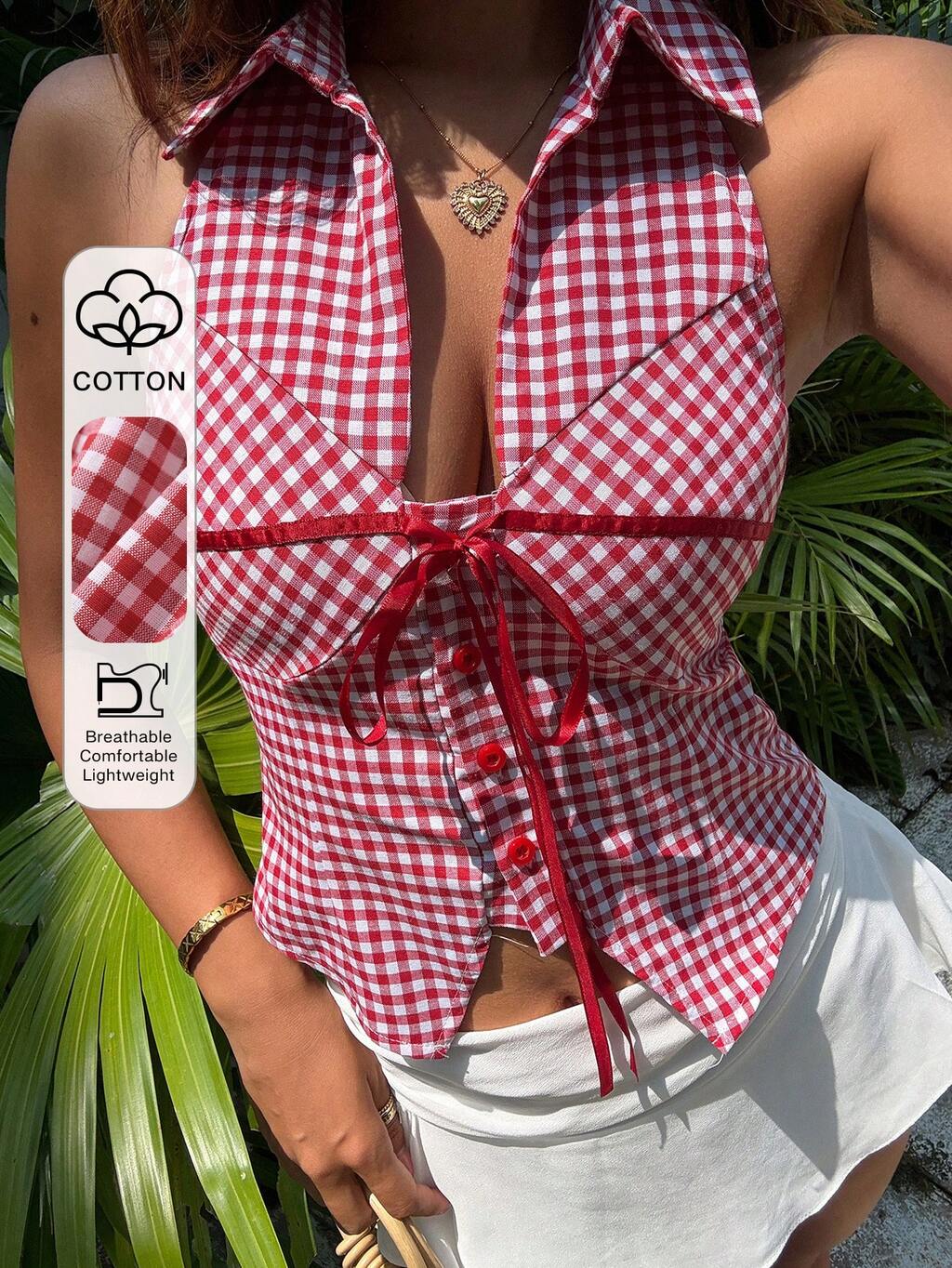 Regata Casual de Verão Cropped Sem Costas com Laço de Fita em Estampa Xadrez Retalhos para Mulheres