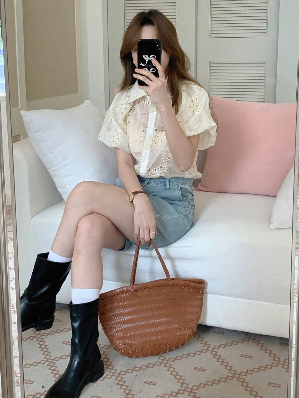 Blusa Feminina de Manga Bufante com Renda Pesada, Estilo Coreano Versátil para o Verão