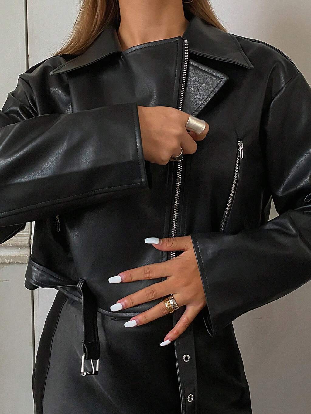 Jaqueta de Couro PU Casual Solta com Zíper para Mulheres, Roupas de Outono