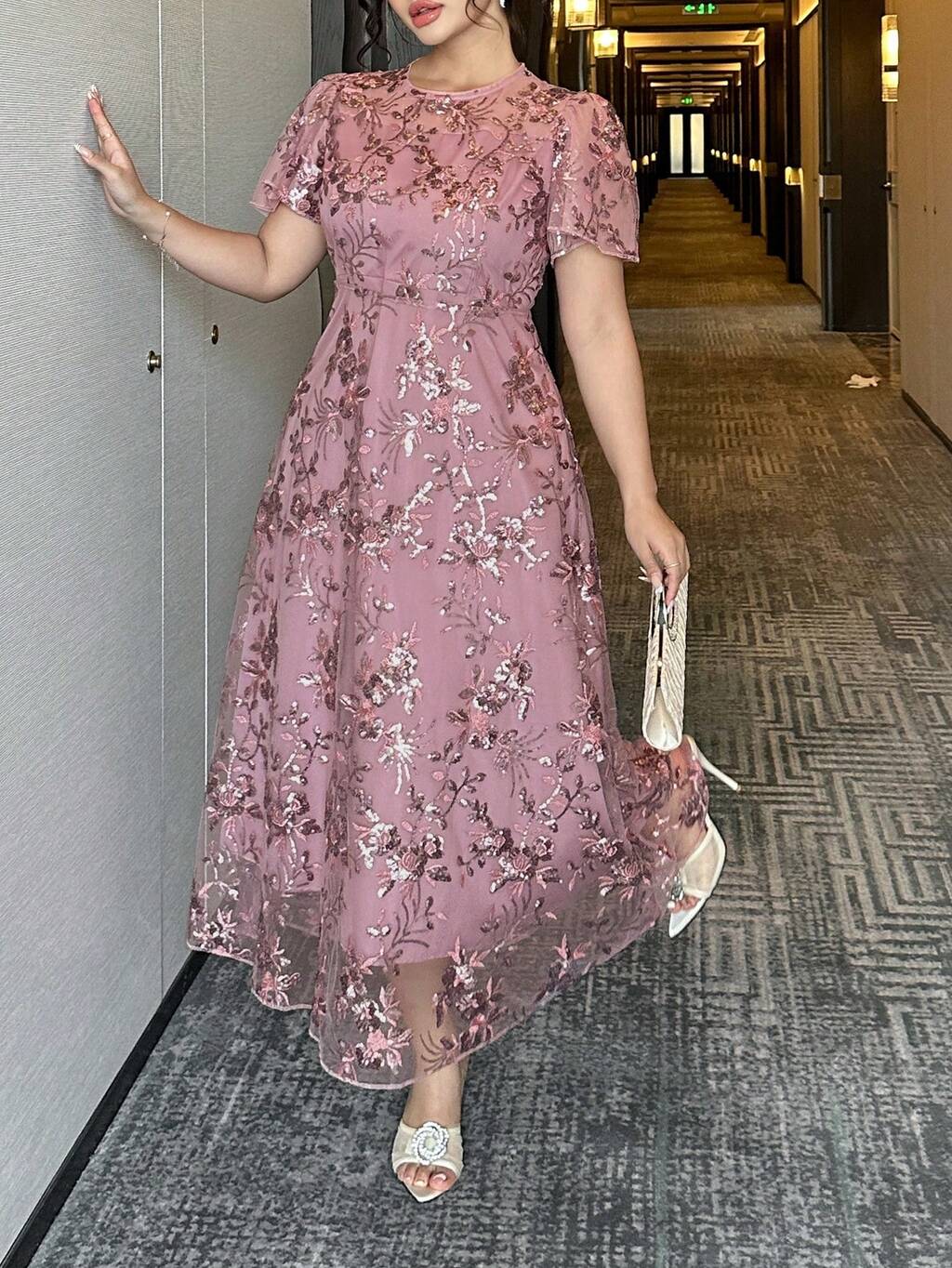Dazy Plus Vestido Longo de Festa Elegante com Gola Redonda, Mangas Bufantes, Cintura Afunilada e Bordado de Lantejoulas Roxo para Mulheres Plus Size, Vestido de Verão