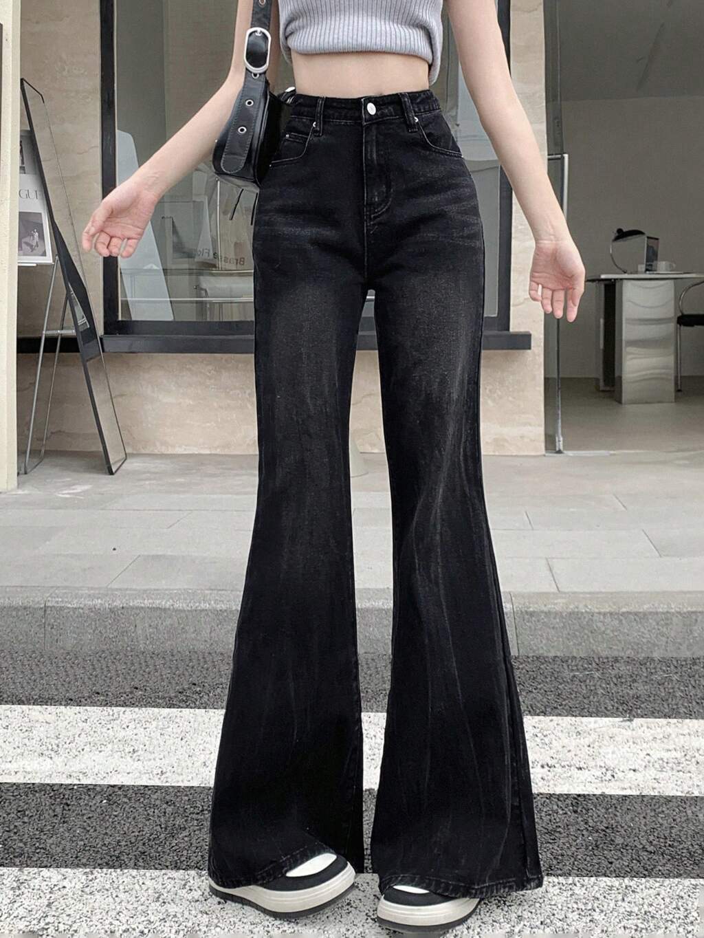 Calças Denim Longas Femininas com Perna Boca de Sino na Moda
