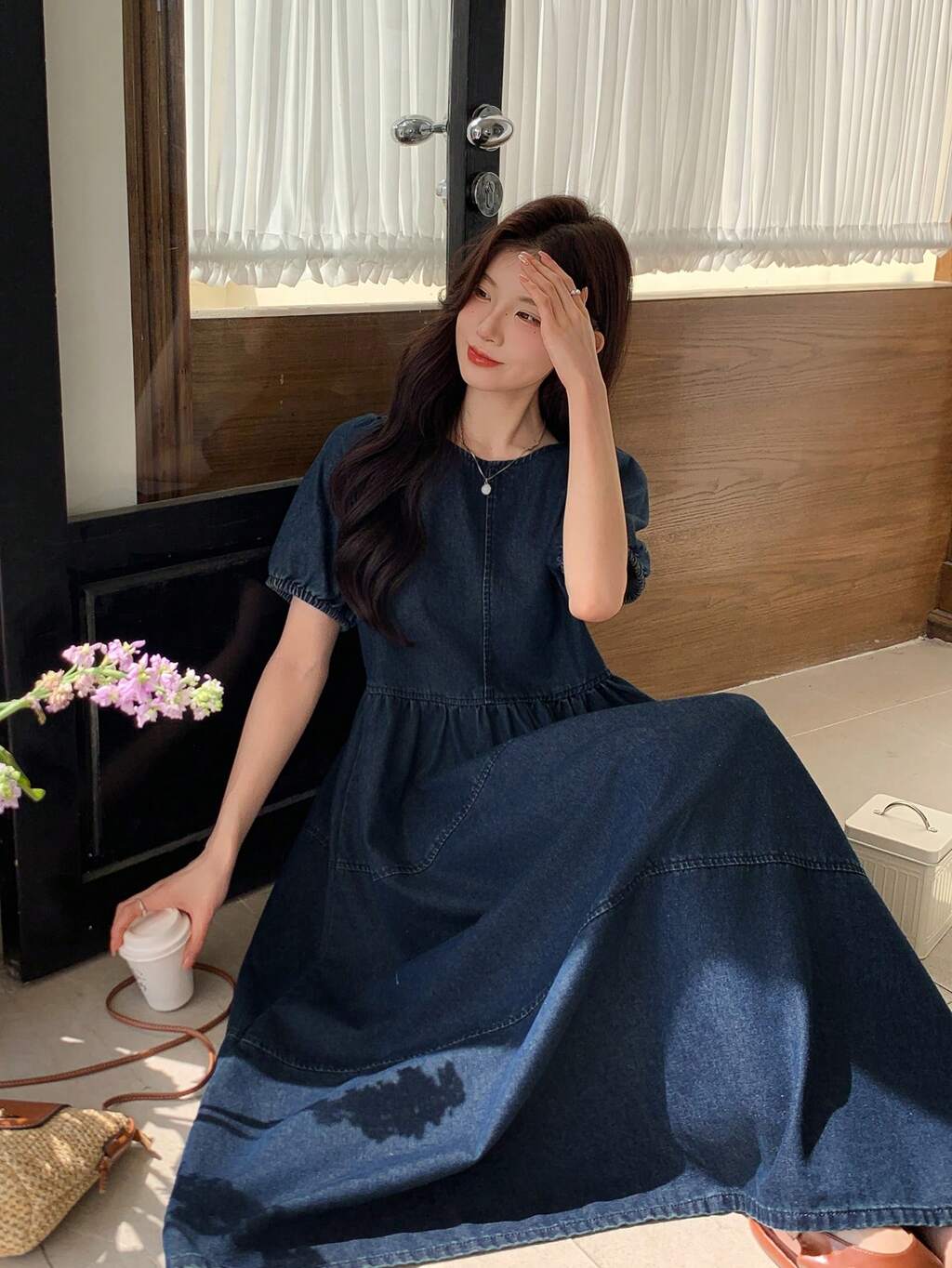 Vestido de Skater Solto de Denim com Gola Redonda e Manga Curta Bufante Casual para Mulheres
