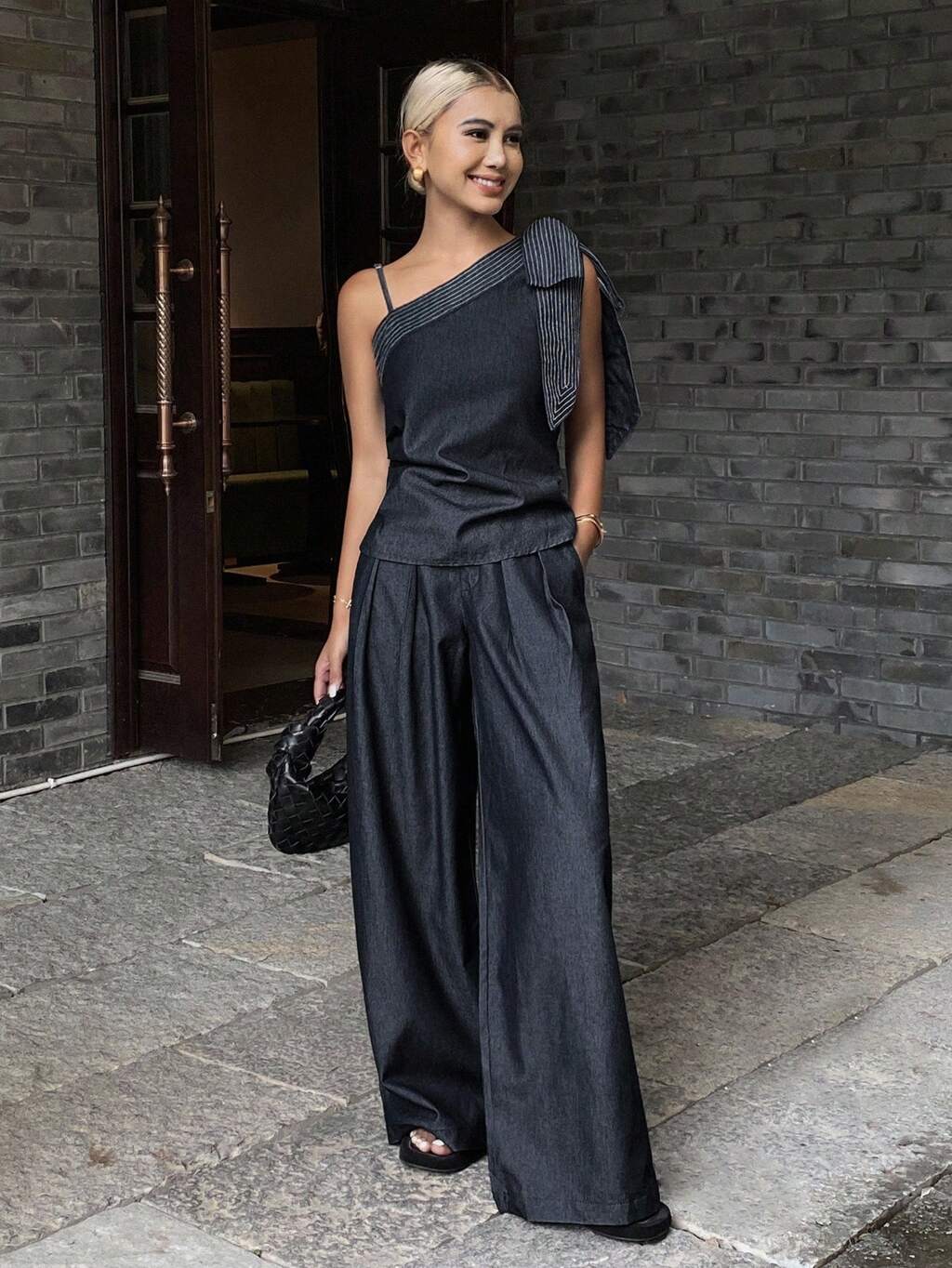 Conjunto de Férias Denim de Duas Peças com Top Assimétrico com Laço no Pescoço, Listrado e Recortes, Sem Mangas, e Calça Larga e Casual