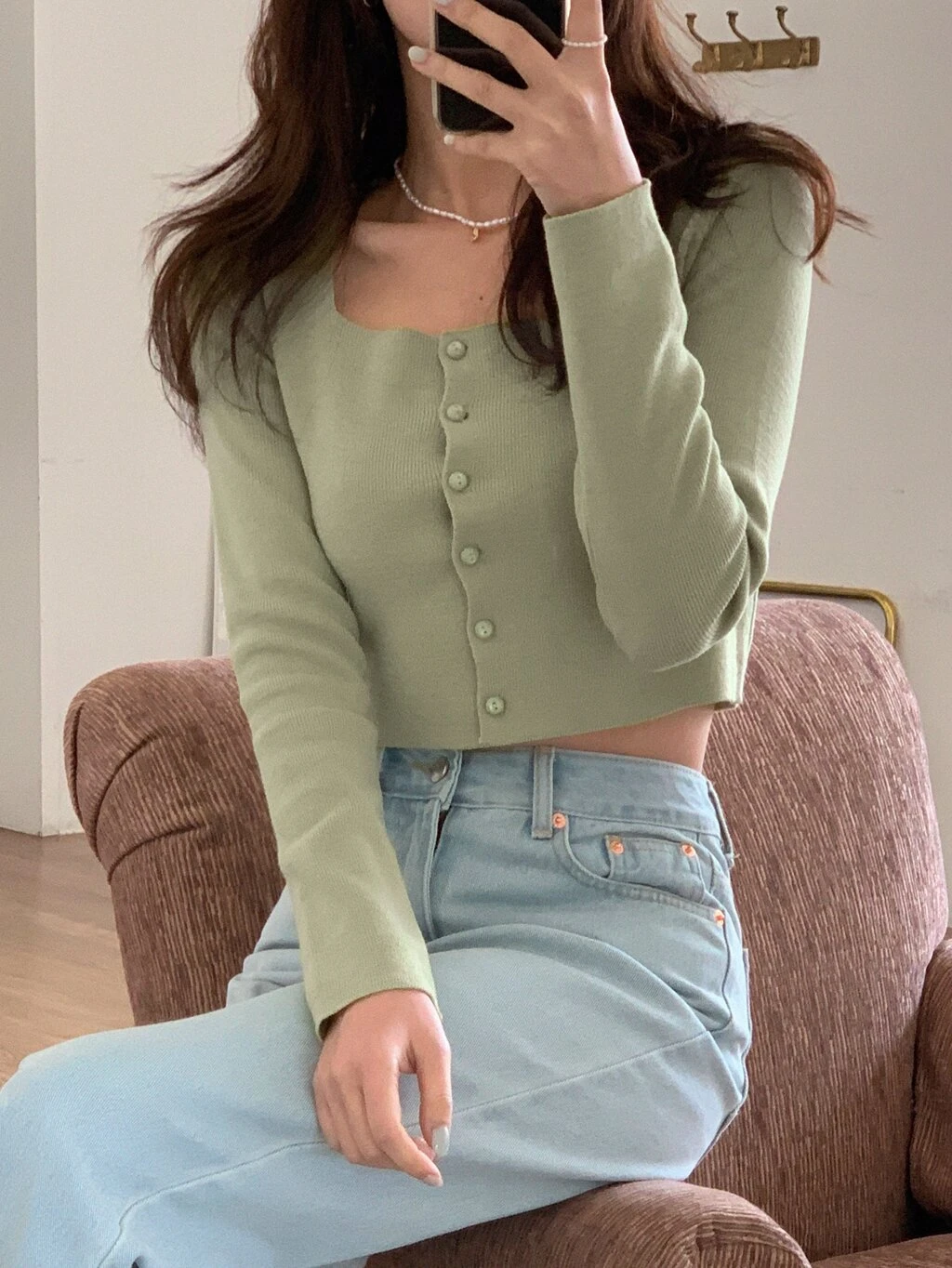 Camiseta Cropped com Botões Sólidos, Roupas de Outono Manga Longa Blusas Femininas Tops Fofos
