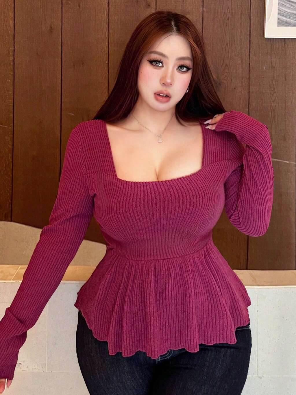 Dazy Plus Camiseta Elegante de Manga Longa Cropped com Cintura Marcada, Gola Quadrada Elástica, Cor Fucsia, Primavera/Outono