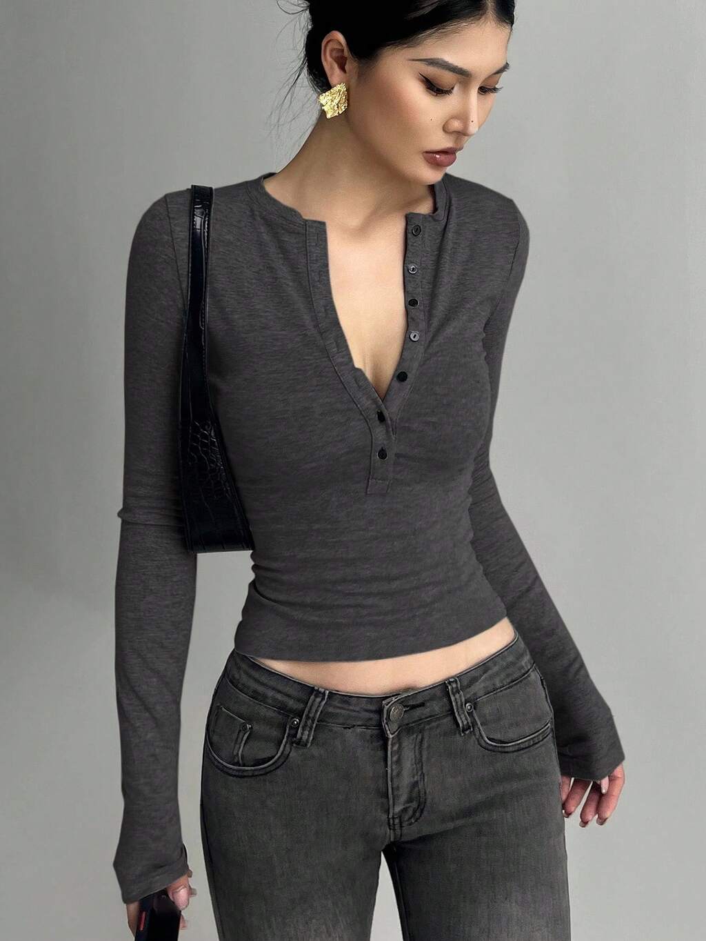 Camiseta Feminina com Mangas Longas, Botões na Frente e Recortes em Renda, Estilo Y2K, Primavera