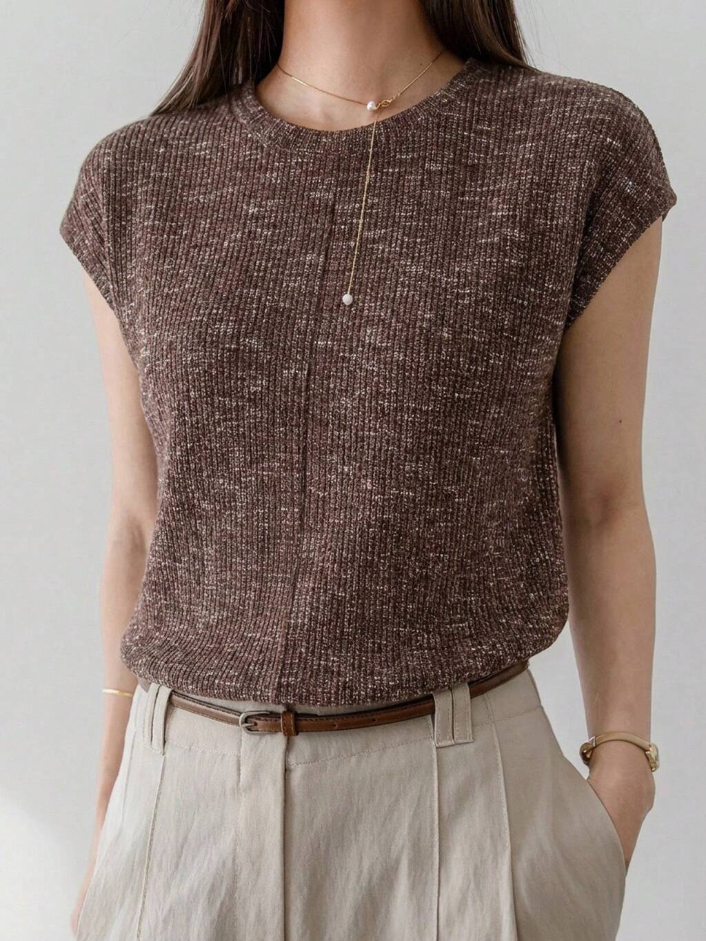 Camiseta de Manga Curta Elegante para Mulheres, Design Minimalista Casual Elegante com Textura Marrom, Adequada para Escritório, Negócios Casuais e Uso Diário, Ideal para Verão e Primavera
