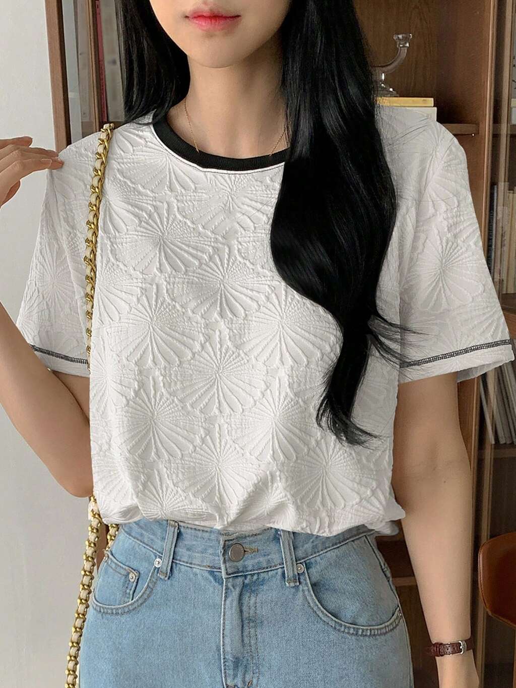 Camiseta Feminina de Manga Curta e Gola Redonda Solta, Textura Contrastante, Verão