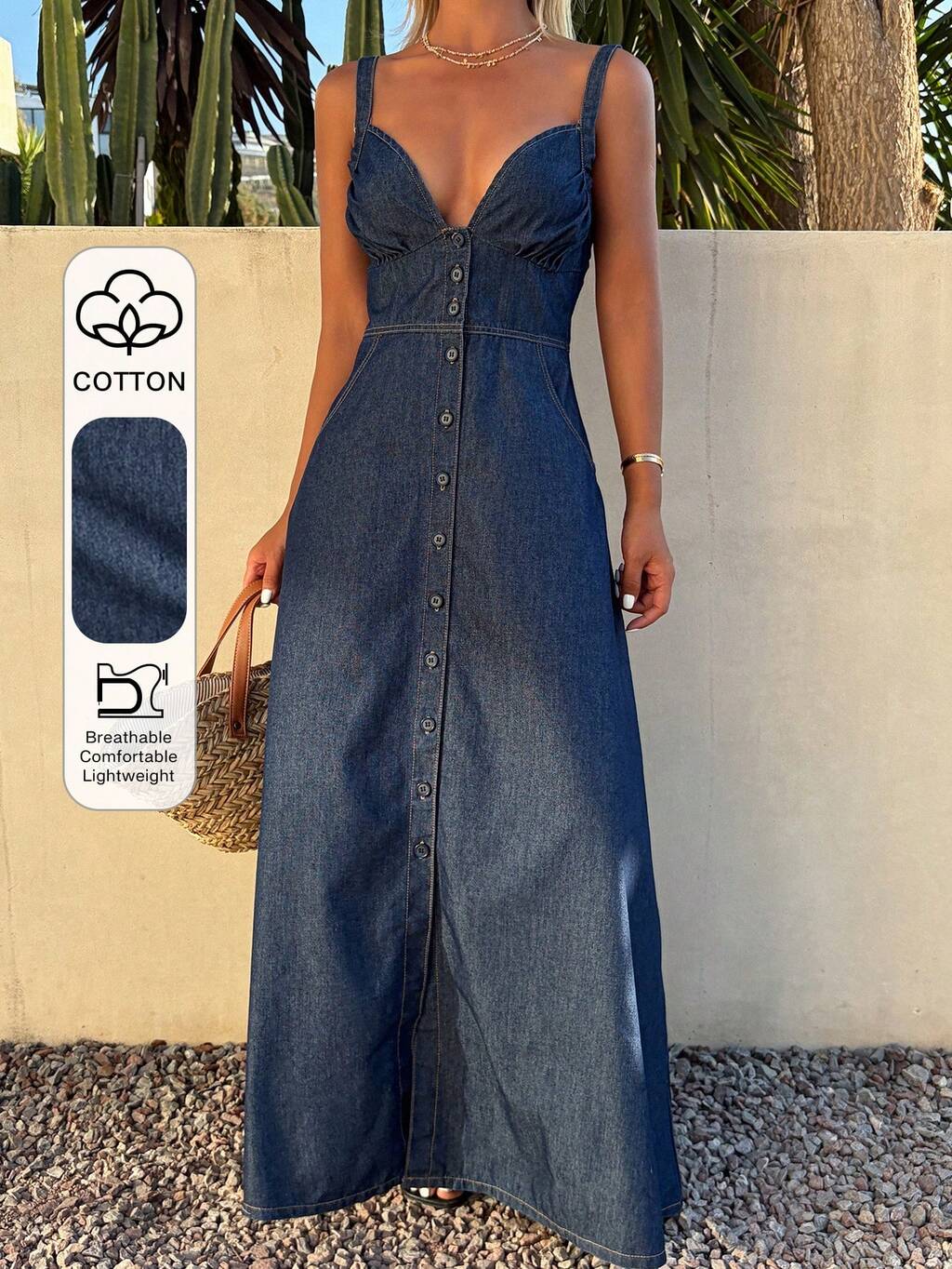 Vestido Denim Retrô Azul Escuro com Decote em V, Botões na Frente e Fenda, para Férias e Praia