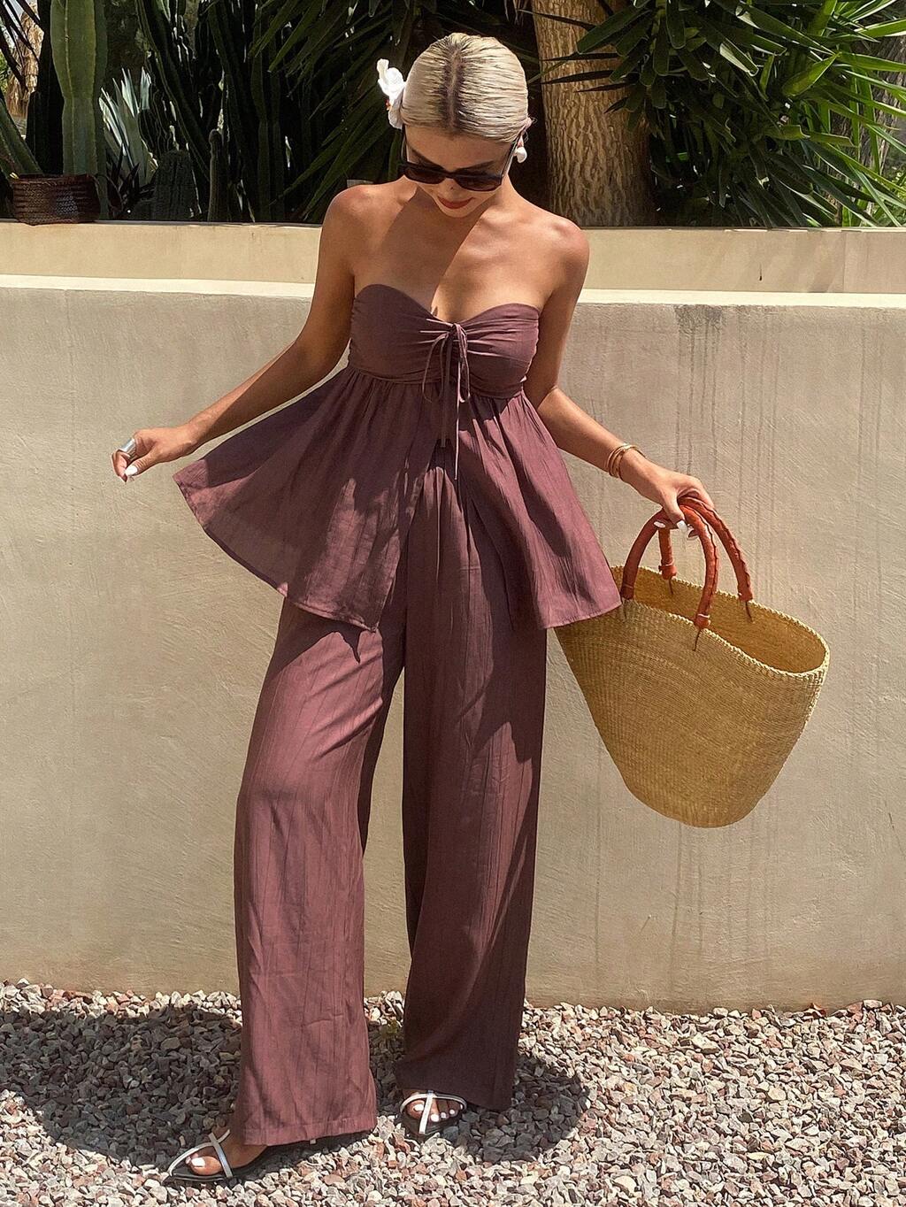 2 peças Conjunto Top Bandeau e Calça Perna Larga Feminino, Fashionable para o Verão