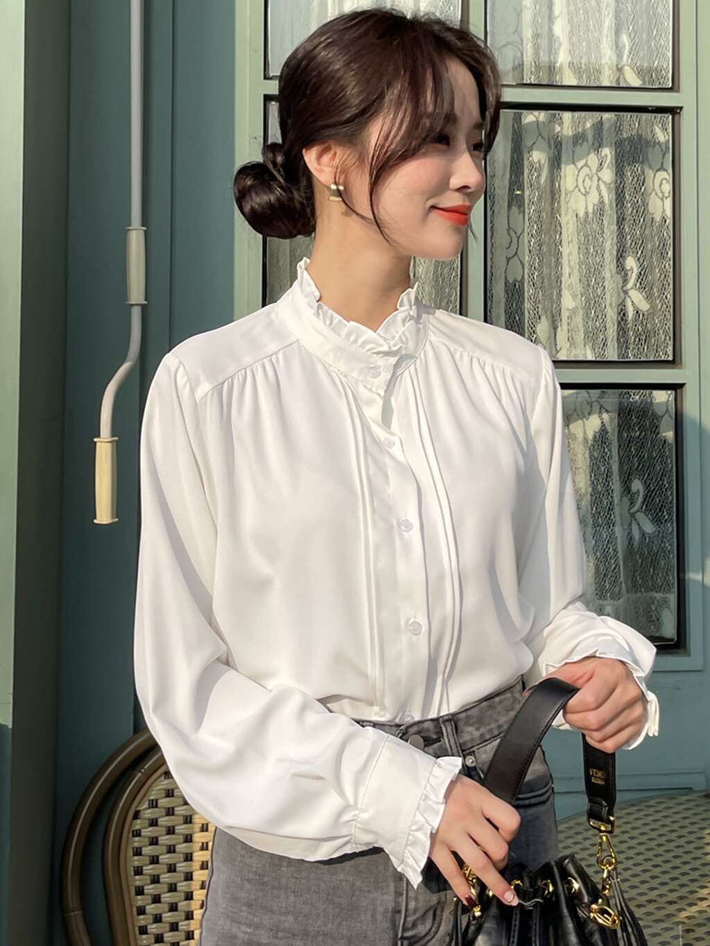 Camisa de Manga Longa com Gola Plissada e Cor Sólida, Roupas de Outono