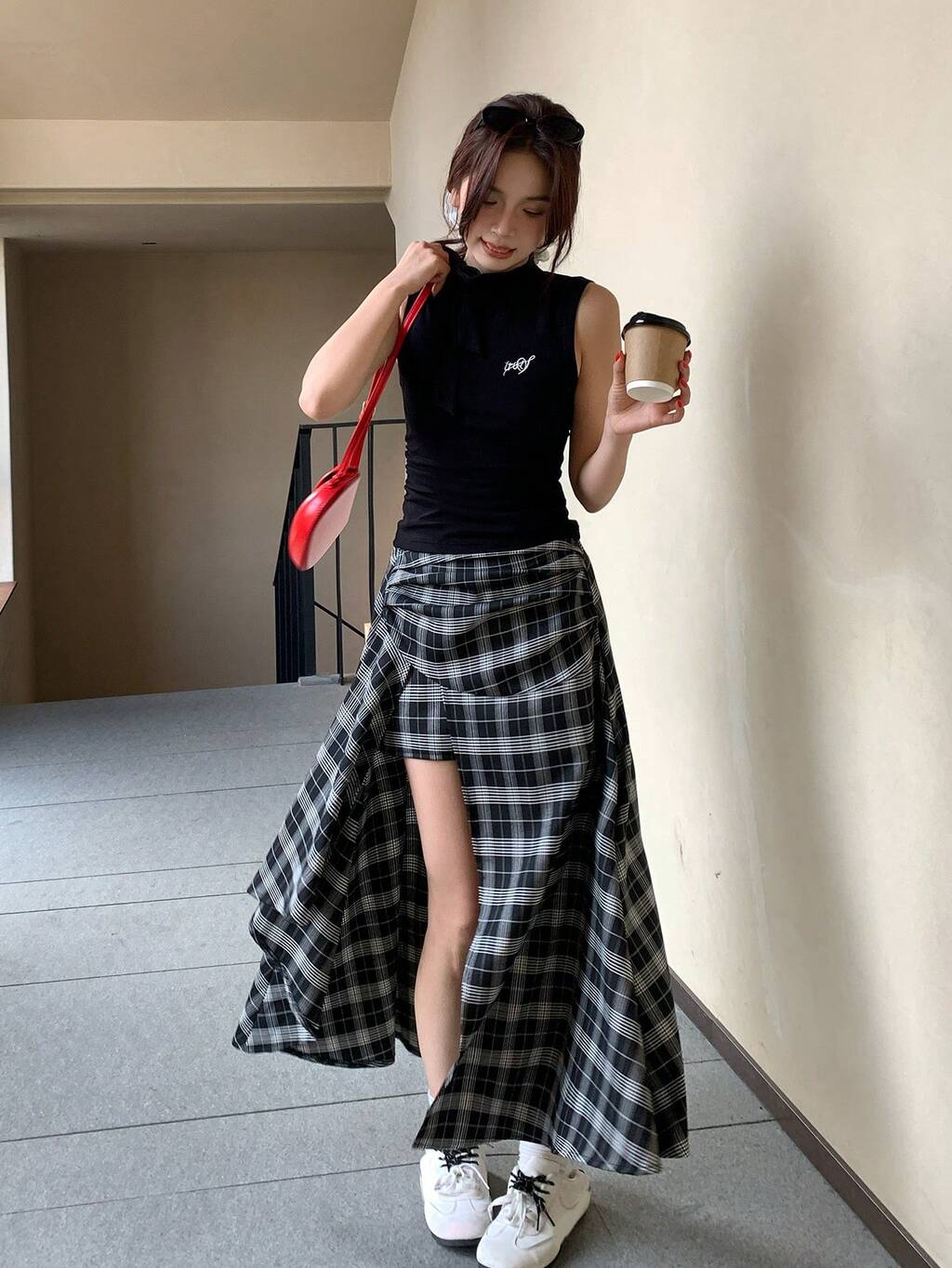 2 peças Conjunto de Saia Xadrez + Top Camisole de Malha com Laço Verão para Mulheres