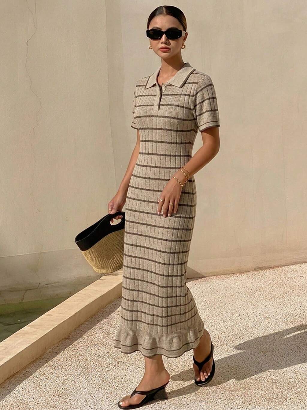 Vestido de Tricô Elegante Feminino com Gola Virada e Listras Coloridas, Verão