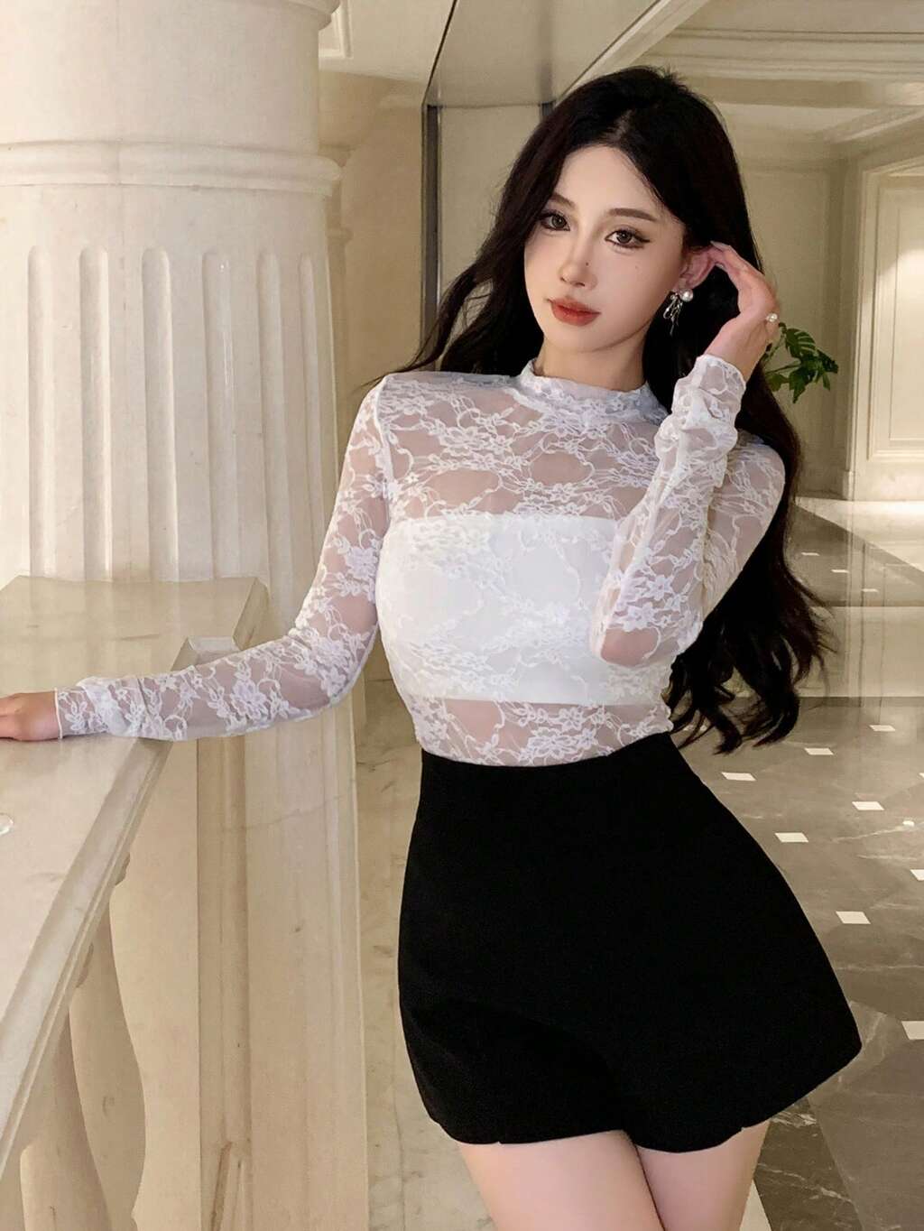 Lace See-Through Mock Neck Long Sleeve Blouse For Women, Back To School Going Out Tops Sheer,Fall Women Clothes